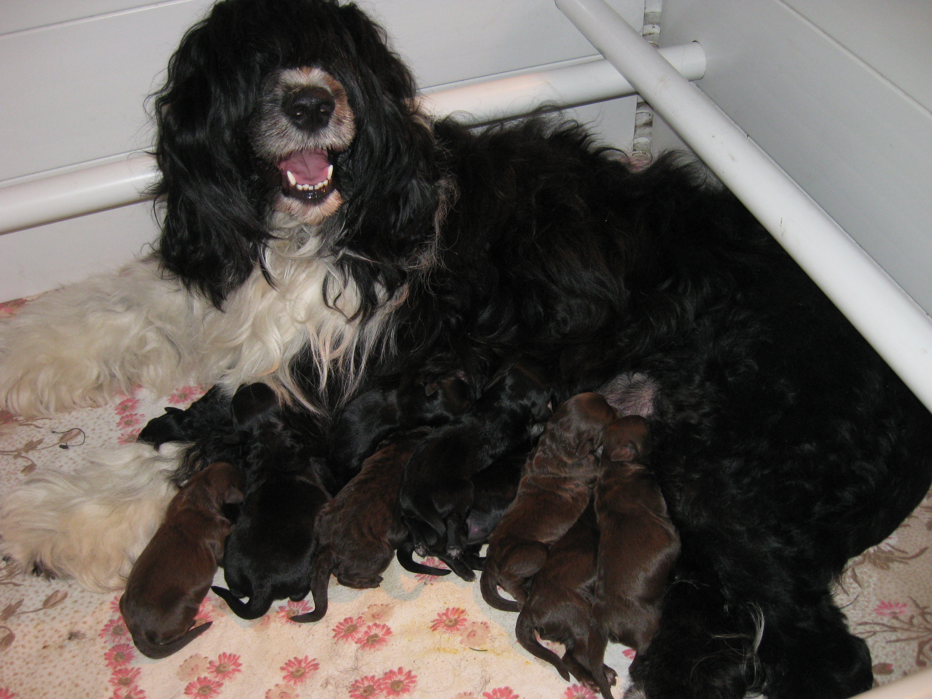 13.03.2012 Heute nacht - zwischen 4.15 Uhr und 6.45 Uhr - hat "Leoa" (Questar's Something In The Air at Go and Win) ihre Welpen zur Welt gebracht, 7 Rüden und 3 Hündinnen, alle schwarz wavy. Sie sind putzmunter und Leoa kümmert sich vorbildlich um die Kleinen.